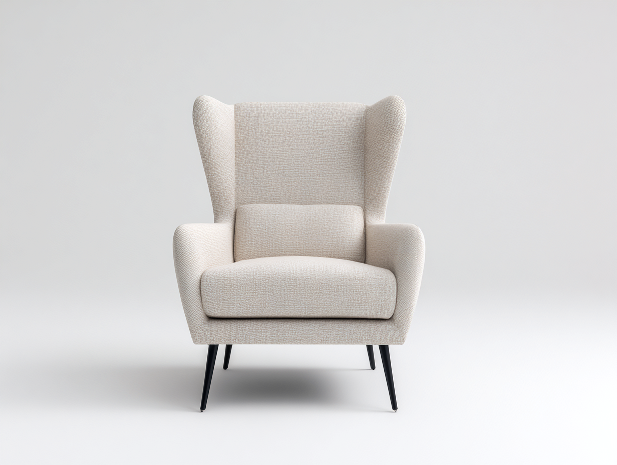 Poltrona moderna in tessuto beige chiaro, pensata per offrire comfort e luminosità al soggiorno.
