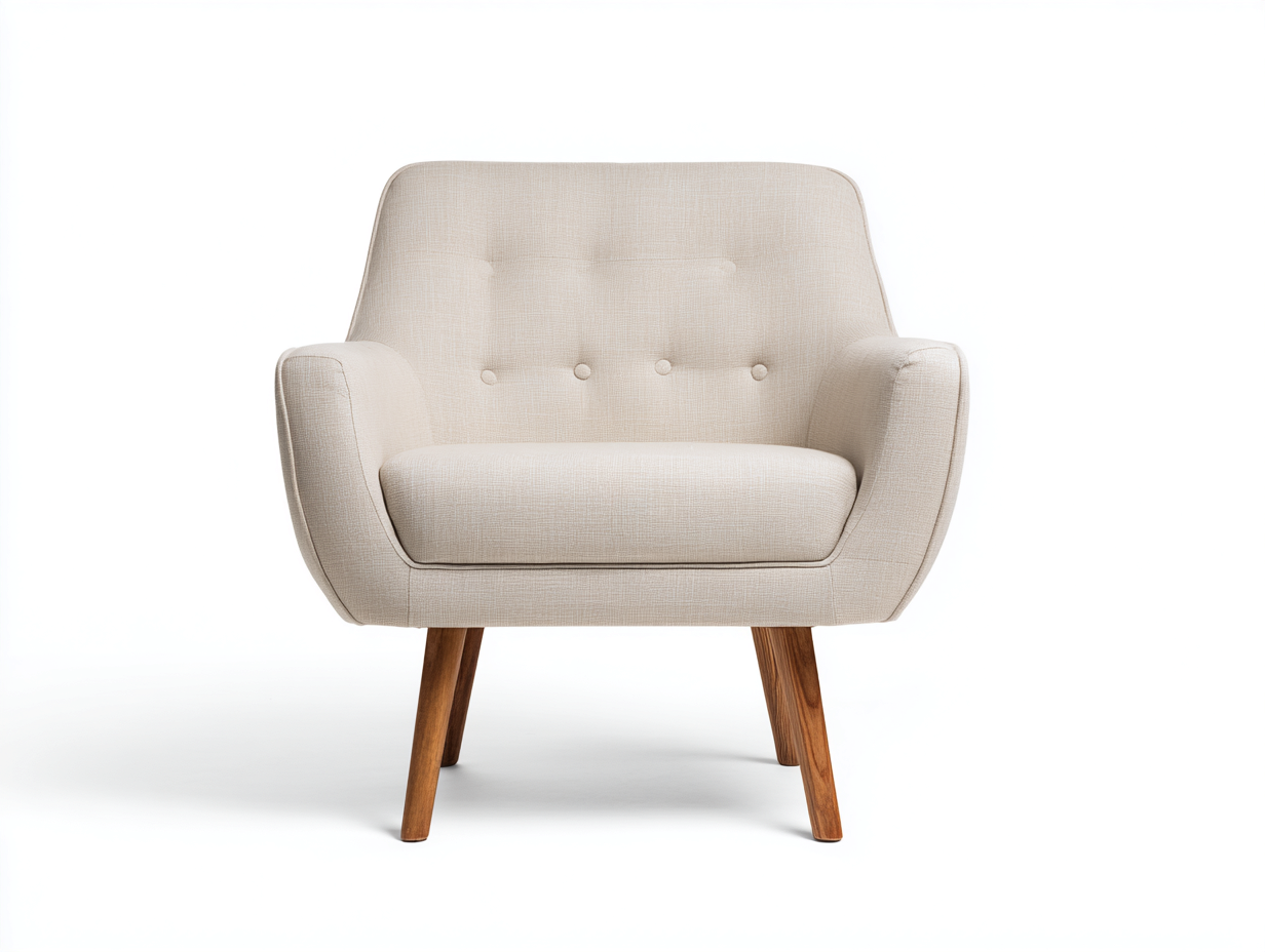 Poltrona in stile scandinavo con tessuto beige e piedi in legno naturale.
