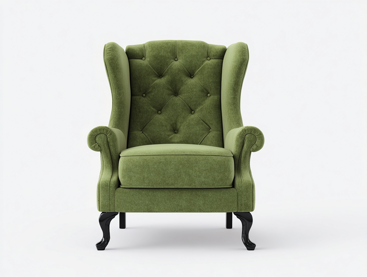 Poltrona wingback in tessuto verde oliva dallo stile classico, perfetta per soggiorni e angoli lettura.